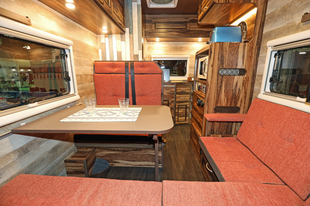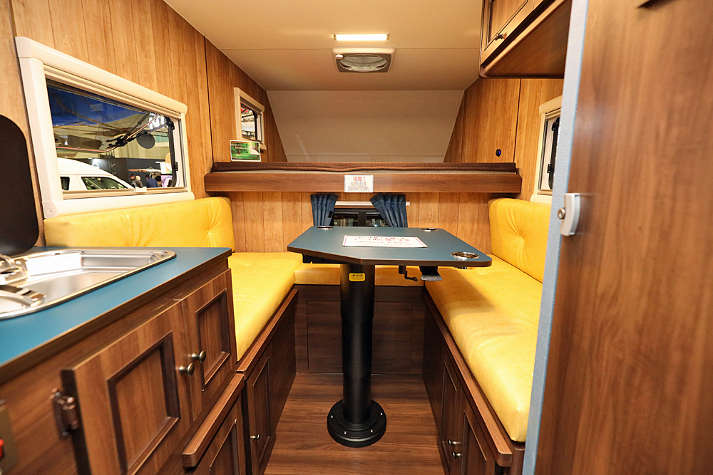 内装は既存モデルと同様で、横向きソファの対面ダイネットを採用しています。このレイアウトは、開放感があることと、ファミリーでテーブルを囲めることがメリット。正面奥には、トラキャン最大のアドバンテージともいえる大きなバンクベッドが完備され、ダイネットをベッド展開すれば、最大5名分の就寝スペースを確保できます。