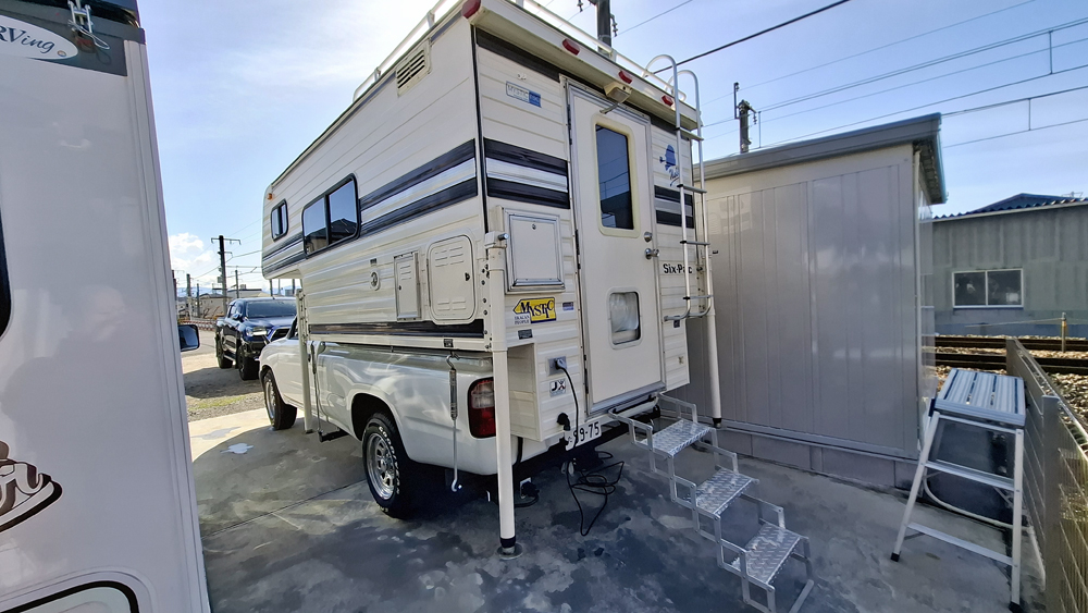 夕方に無事取材を終え、その日は佐藤社長の自宅にあるトラキャンで宿泊しました☆ アメリカ・Six-Pac社のノーブル75を積載したこのトラキャンには、深い歴史とストーリーがあります。実はこのシェル、1990年代初頭にミスティックのキャンパー2号車として販売されていたもの。頻繁に展示会に出展する余裕がなかった当時、自らトラキャンに乗って家族とキャンプに行くことが、佐藤さん流の営業活動でした。このシェルは、当時の佐藤さんが実際に使用していた思い出の個体。ユーザーの手に渡ったシェルを数10年後に買い戻し、4カ月がかりのレストアで当時のままの姿に復活させたものです。そんな歴史が詰まったトラキャンに泊まらせていただくのは、現役トラキャン乗りのキャンピングカーライターにとって光栄の至りです☆