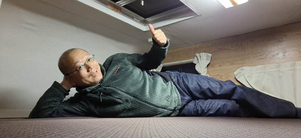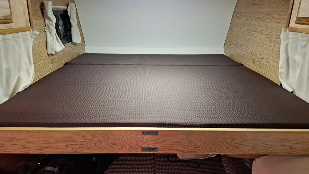 マットに触れてみてまず感じたのは、表面の肌触りが良く、もっちり感と反発力が絶妙なこと! 表皮が柔らかいので直接寝ても快適だし、強い力で上からマットを押してもすぐ元の状態に戻ります。実際に寝てみると、通常のマットよりも弾力があって、沈み込みが少なく、体をしっかり支えてくれるのが印象的でした。過度な沈み込みがなく、体を適度に押し戻してくれるので、寝心地は非常に快適♪ 筆者のトラキャンのバンクベッドは、直接寝ると表皮のビニールレザーが冷たく感じられるため、TEIJINの敷きパッドを使用していますが、このマットならそんなものは一切不要。あまりに寝心地が良かったので、久々に早寝早起きをしてしまいました(笑)。「キャンピングカーでも快適な眠りを追求したい」というオーナーは、ぜひ導入を検討してみてください☆