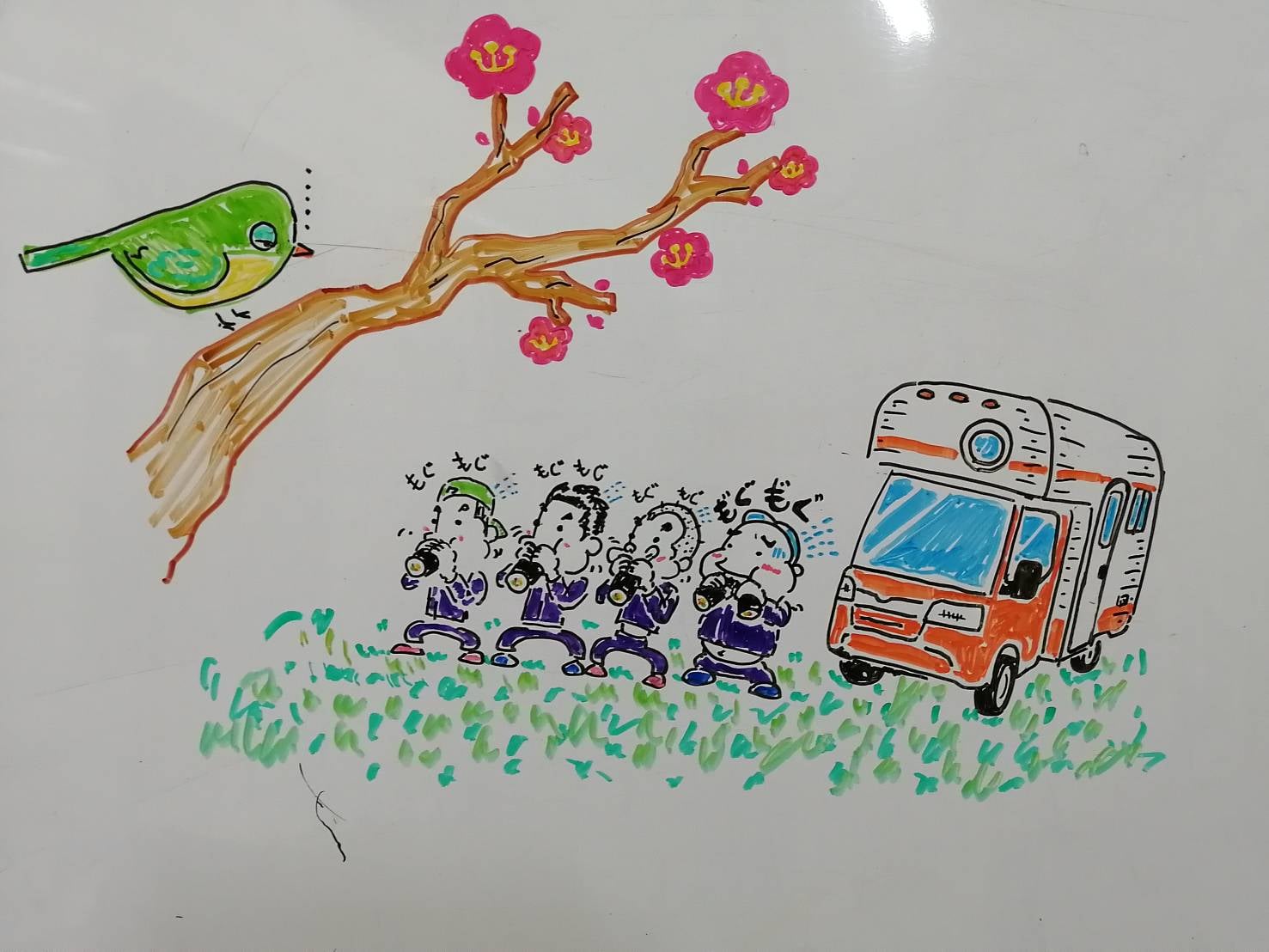 コロナであろうと、季節は確実に春に向かっています。今回は、みんなで恵方巻をガブリとやっています。今年の恵方を知っていますか?先輩!2022年の恵方は「北北西」となります。 二十四方位では「壬」(みずのえ)、正確には「北北西のやや北」で、北を0度とした方位角では「345°」です。これを間違えてガブリとやっていると、「恵方」が「アホウ」になってしまいますよ!先輩!